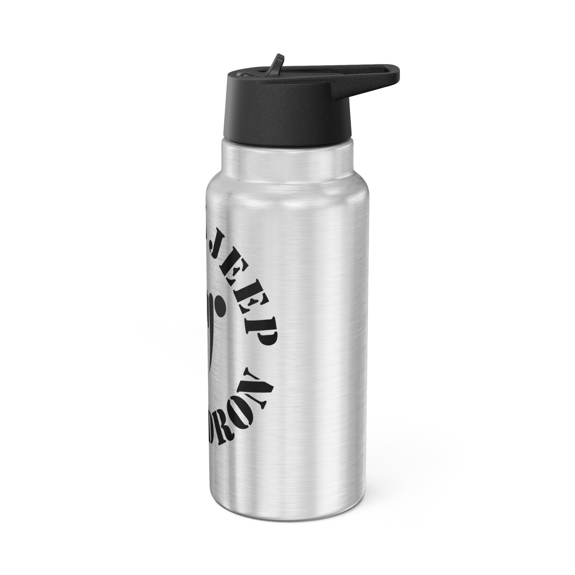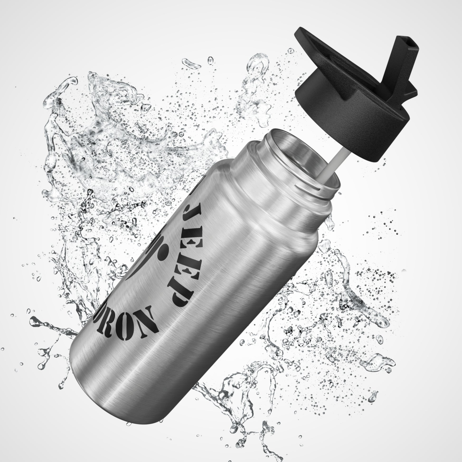 .: Materials: stainless steel bottle, black plastic screw-on cap