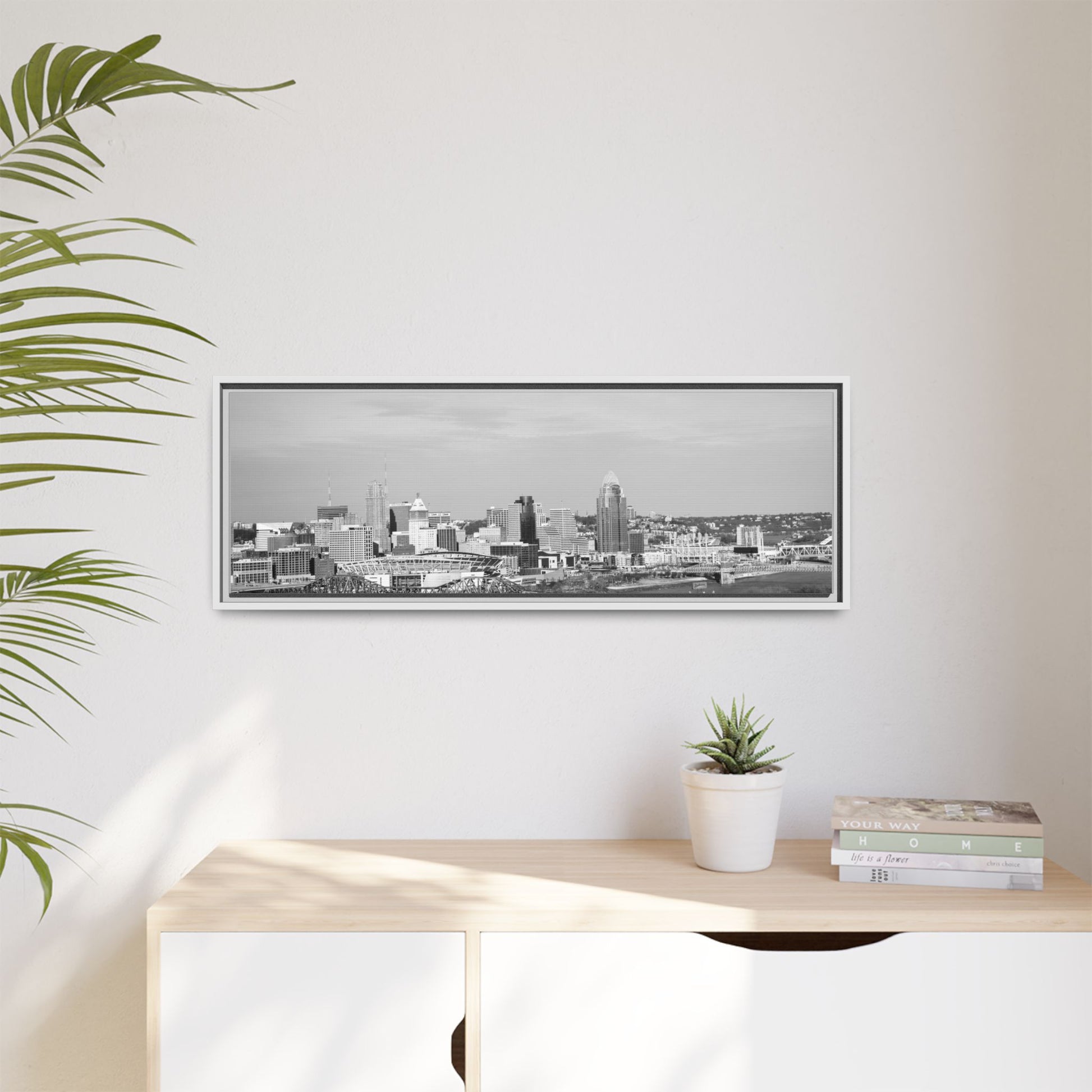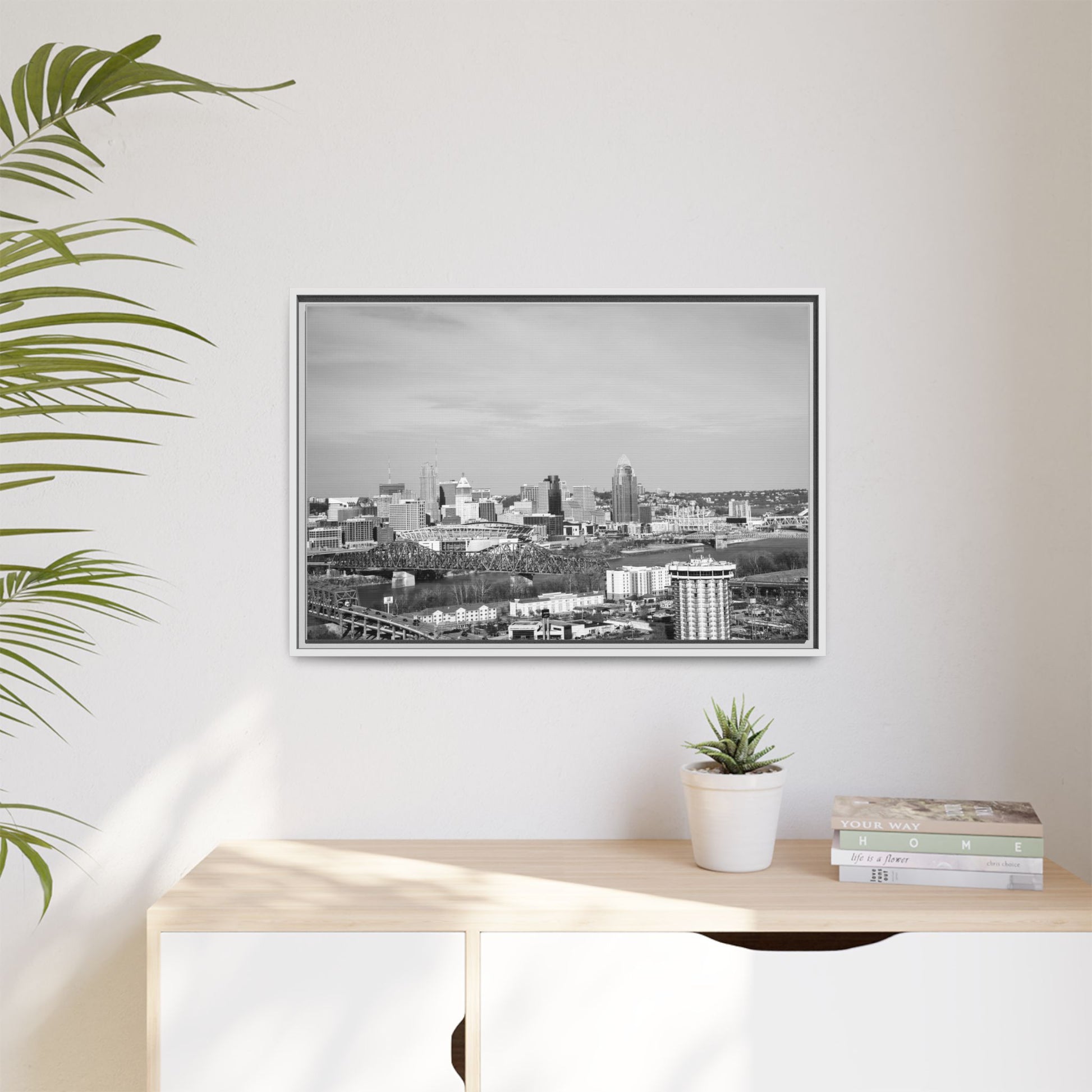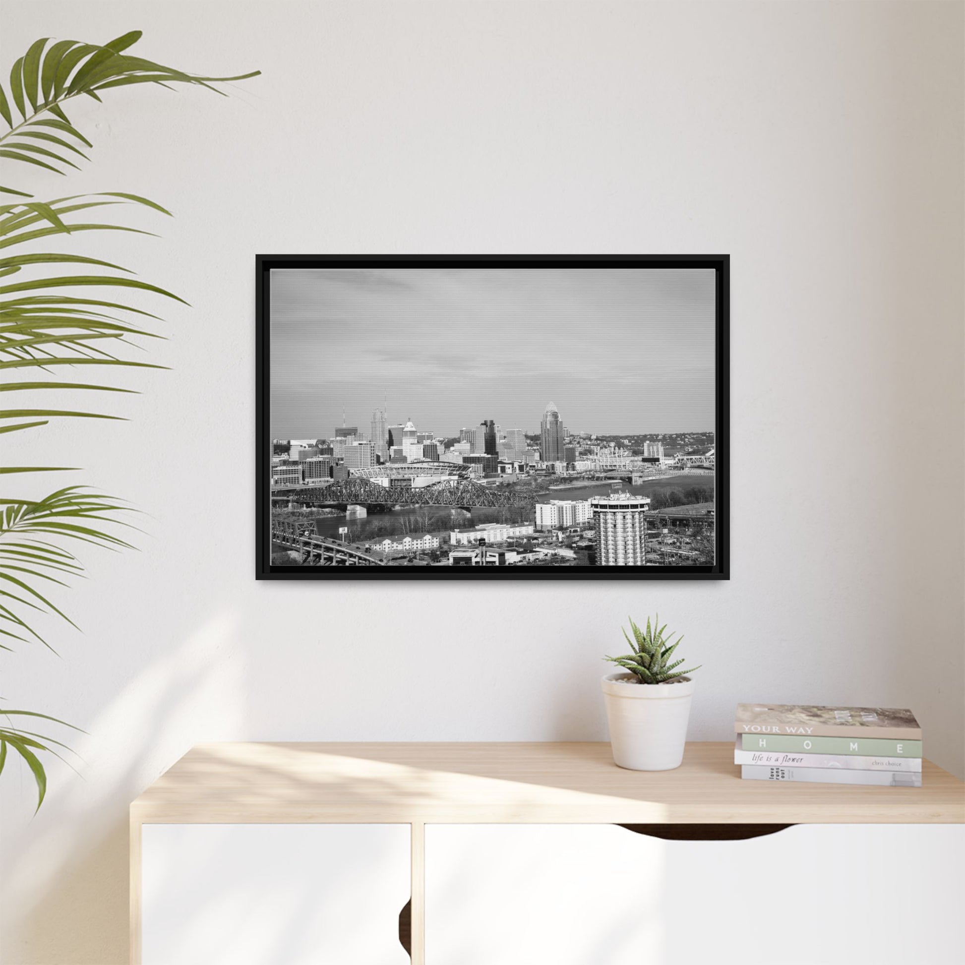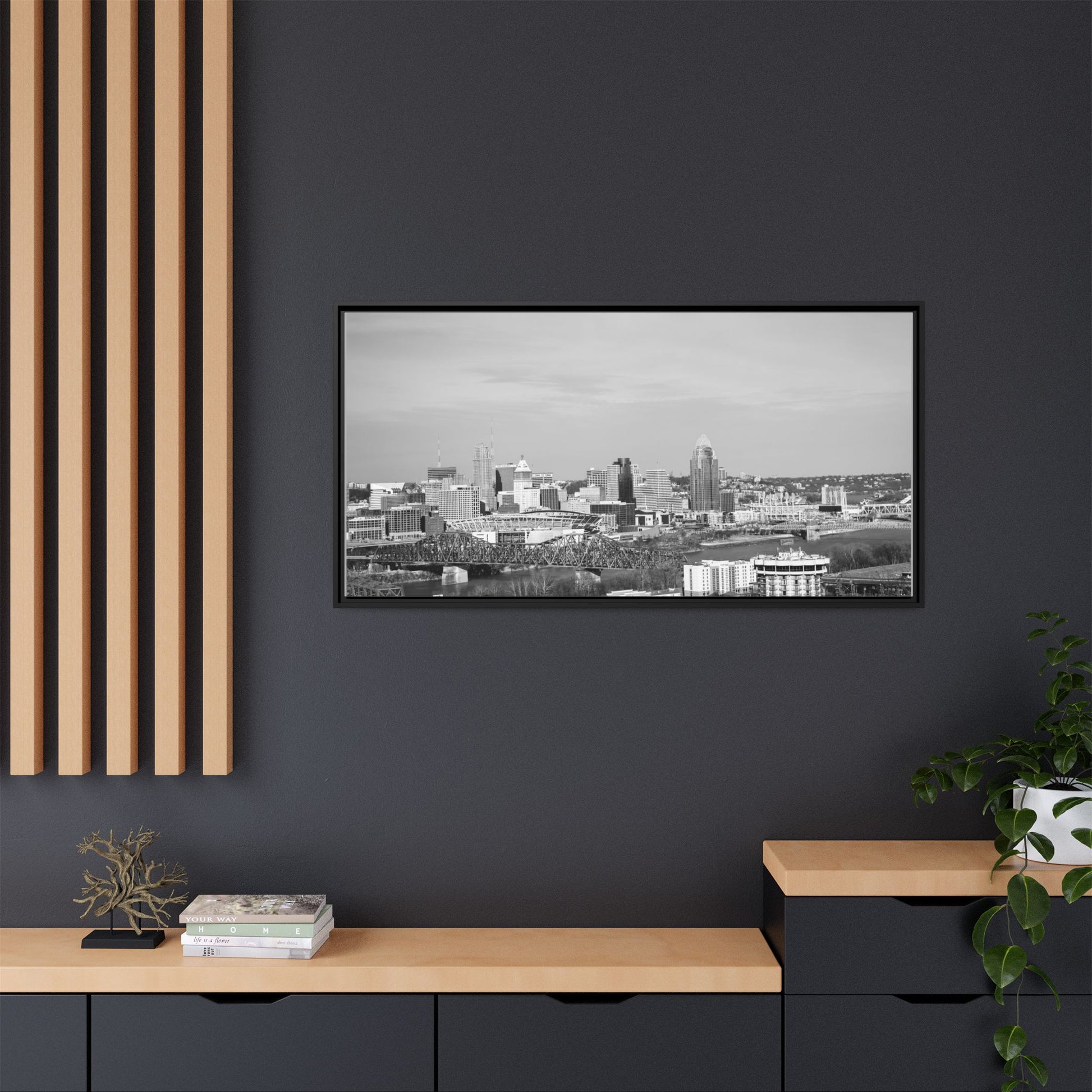 Framed Matte Canvas Chilly Skyline Cincy Print — Black & White Urban Wall Art