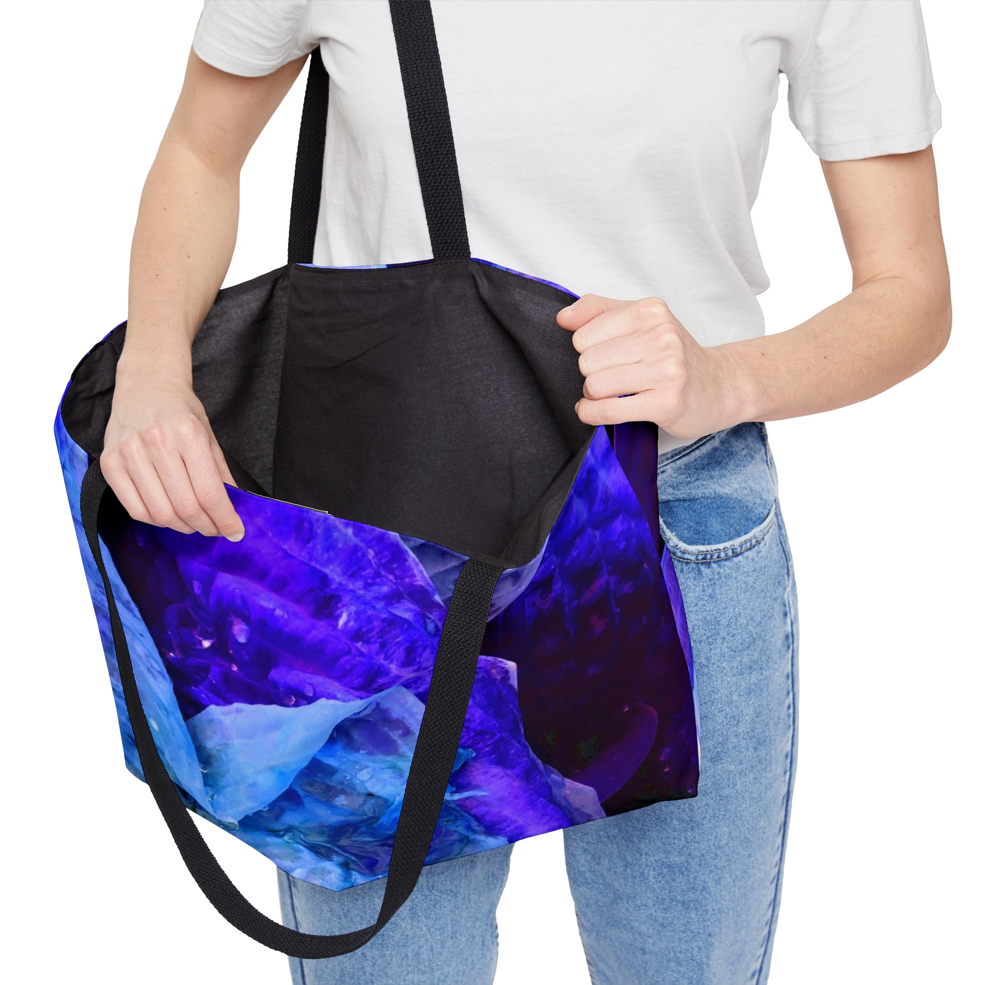 This personalized weekender bag comes in one size – 24" x 13" (60.9 cm x 33 cm) – perfect for those who love to travel light. Its t-bottom construction and black handles give it a sleek, classic look. Start designing, and we'll print your art on the 100% spun polyester in vibrant colors.